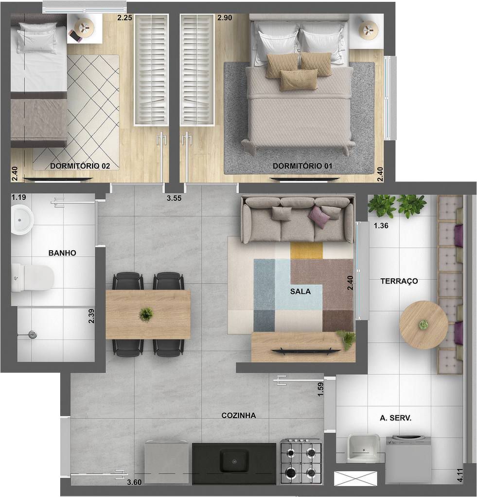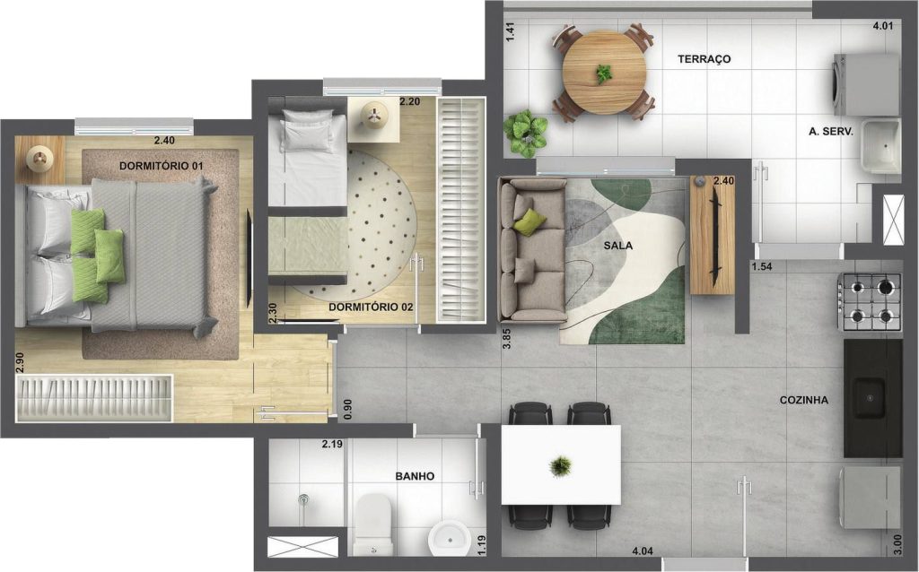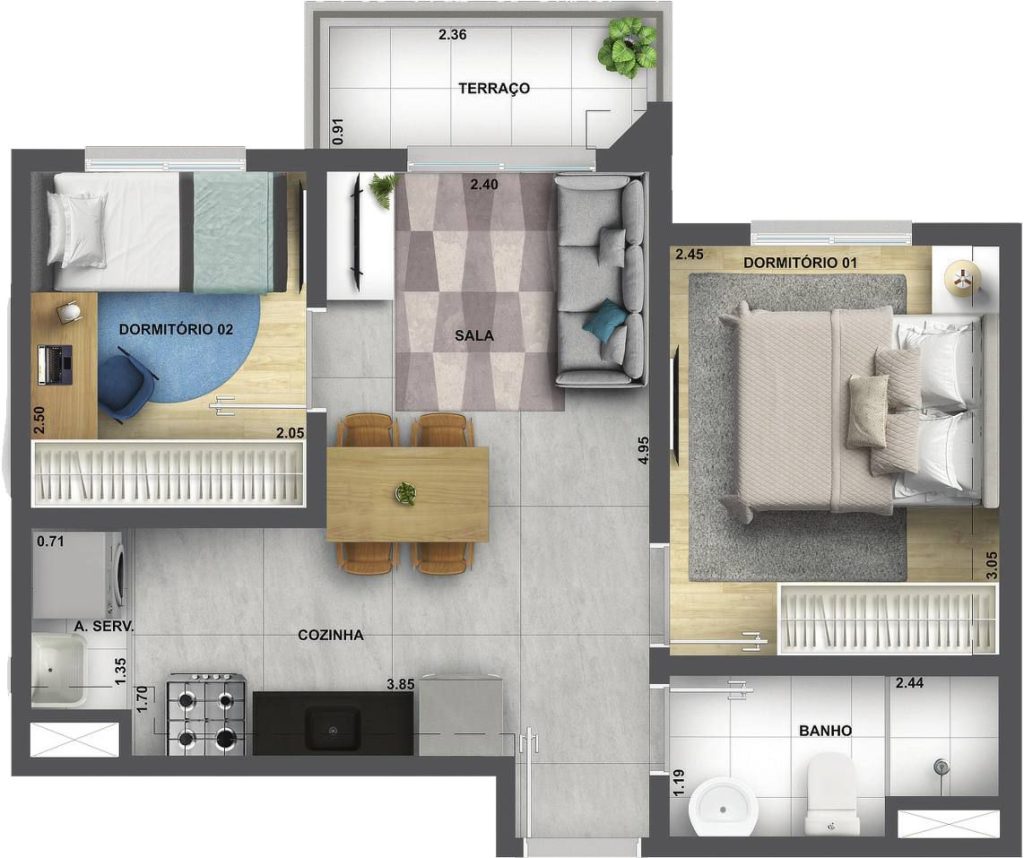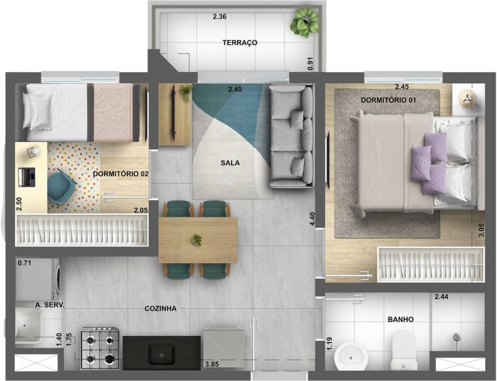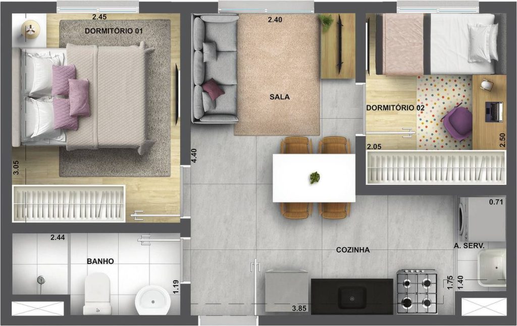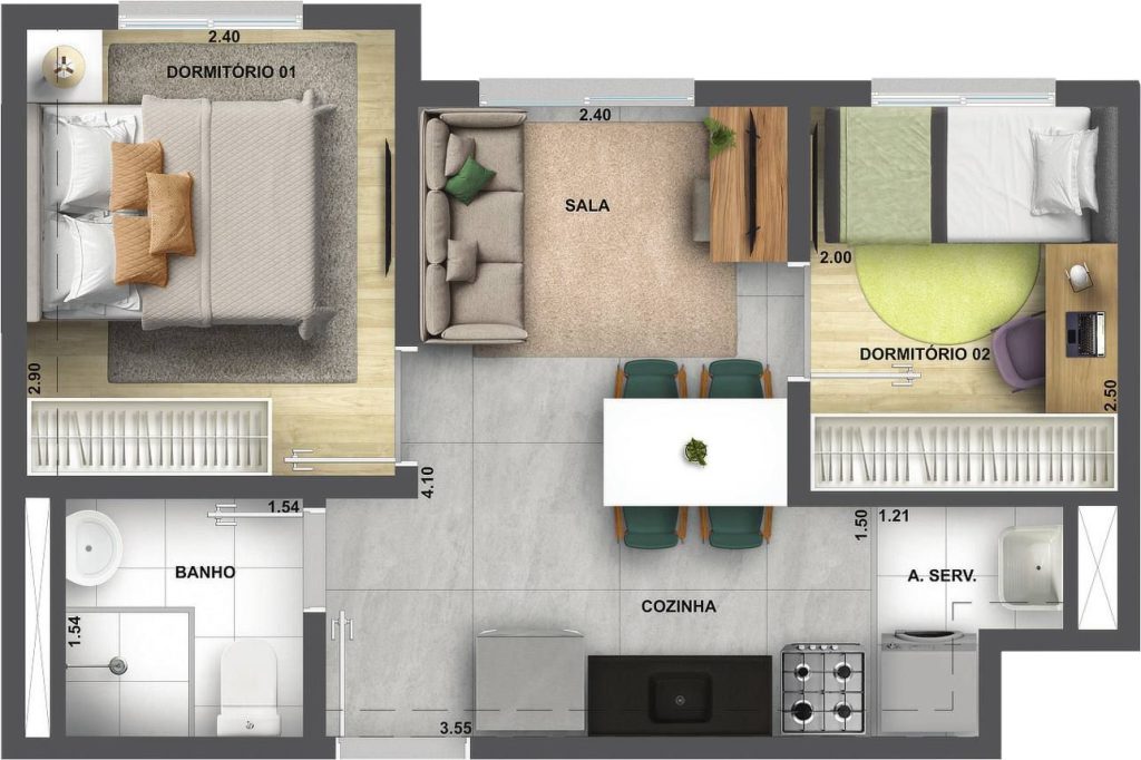Apartamentos bem distribuídos de 21 m² a 44 m², com opções de 1 e 2 dormitórios, espaços integrados e excelente iluminação natural.