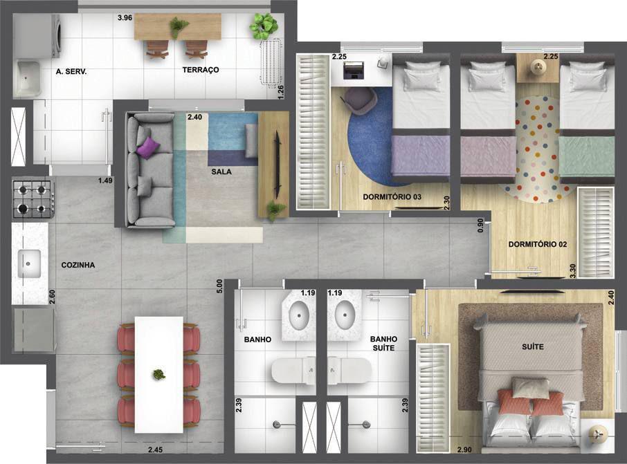 Planta 56m² | 3 dormitórios com Sacada e Suíte