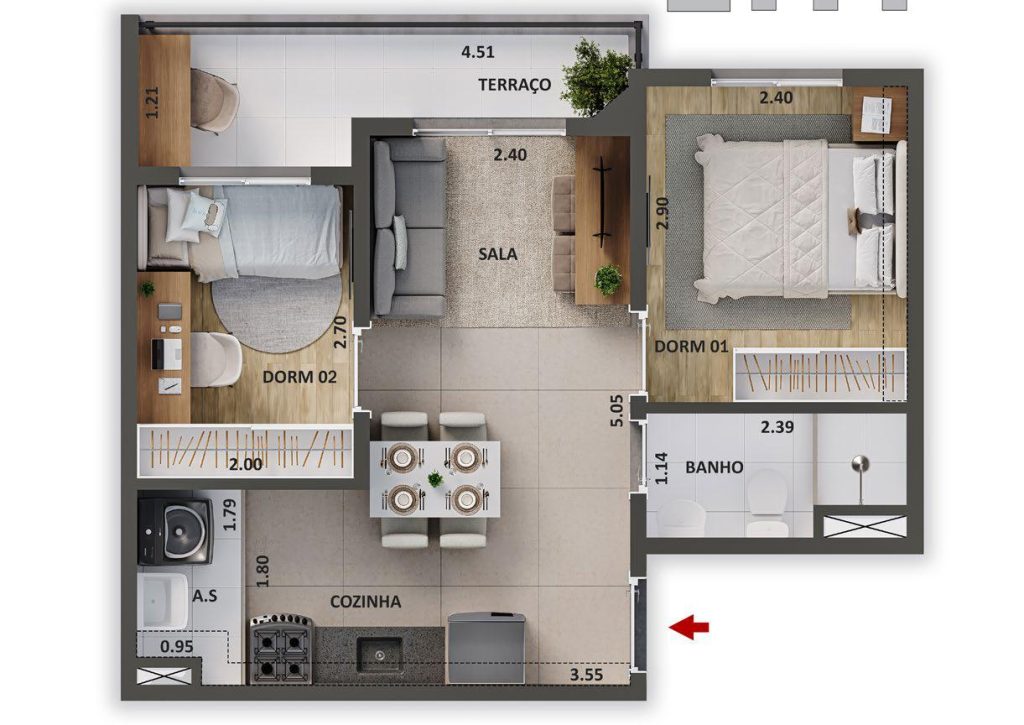 45m² - 2 Dorms com Varanda e Suite, ponta