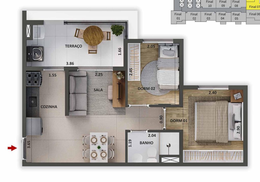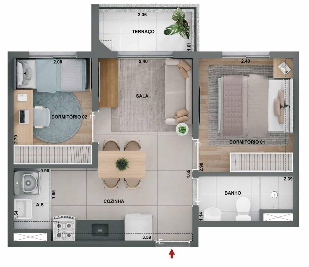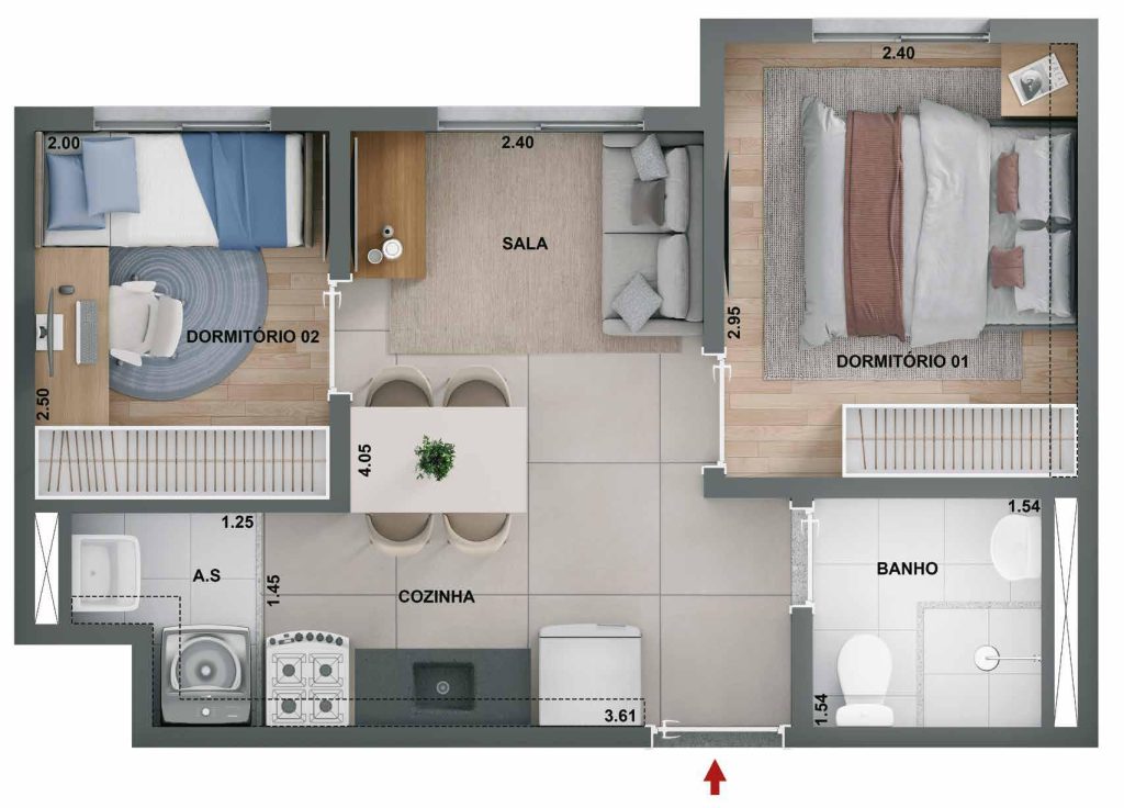 43m² - 2 Dorms com Varanda, ponta
